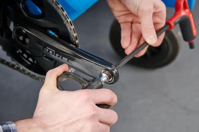 踏板是最容易装错的地方,一定要看清楚上面的 “L”(左)和 “R”(右)。左踏板是反螺纹,要逆时针拧才能拧紧;右踏板是正螺纹,顺时针拧紧。