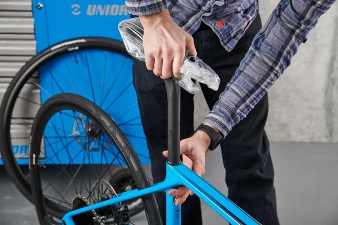座杆大多已经预装了鞍座,先在座管内侧涂好润滑脂(碳座杆涂碳膏),然后慢慢座管里。这里要注意,座杆上通常有一条 “安全线”,最低插入位置不能低于这条线,不然骑行时可能会断裂。